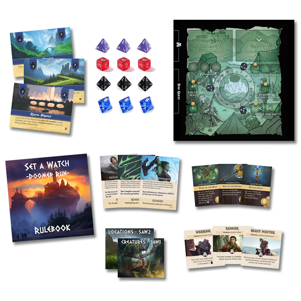 The Doomed Run expansion organized the whole Set a Watch series into a replayable campaign. All of the products from the Set a Watch series are required to enjoy Doom Run as written. In each run, you select a Party of four Adventurers from your Company of heroes. As you play, you will unlock more Adventureres and Mythic items to aid you on your quest through the 7 realms.